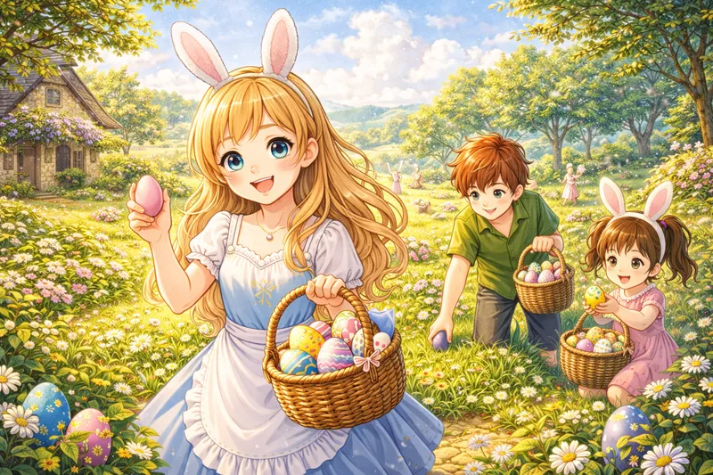 Emma and Max wake up excited on Easter Sunday. After breakfast, they hunt for colorful eggs hidden in the garden by their parents. Emma finds six eggs and Max finds five. Dad tells them there is one more egg to find. Max discovers a big golden egg full of chocolate on a bench. The children share the chocolate and celebrate the best Easter ever.