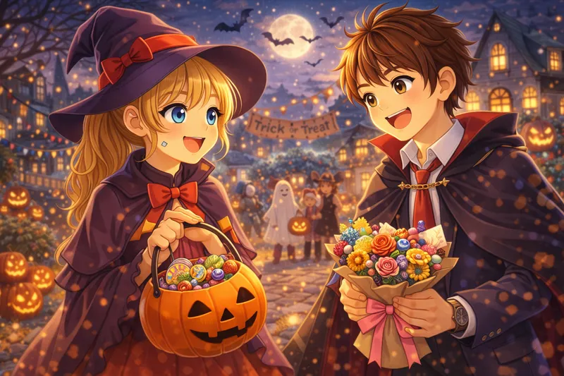 Emma and her brother Tom celebrate Halloween. Emma dresses as a witch with a black dress and hat, while Tom is a vampire with a cape. They go trick-or-treating with their father, collecting candy from neighbors. After visiting many houses, they return home with bags full of sweets and share their excitement about the best night of the year.